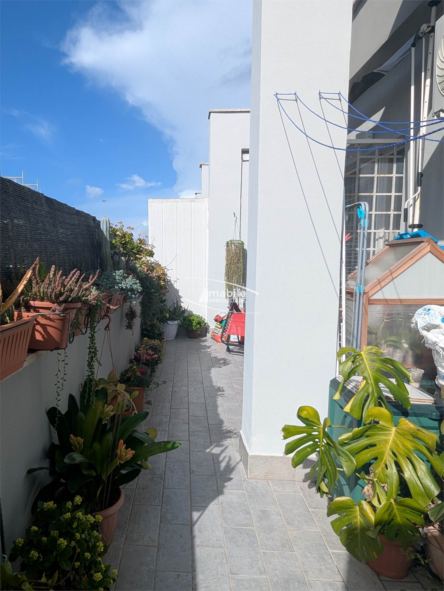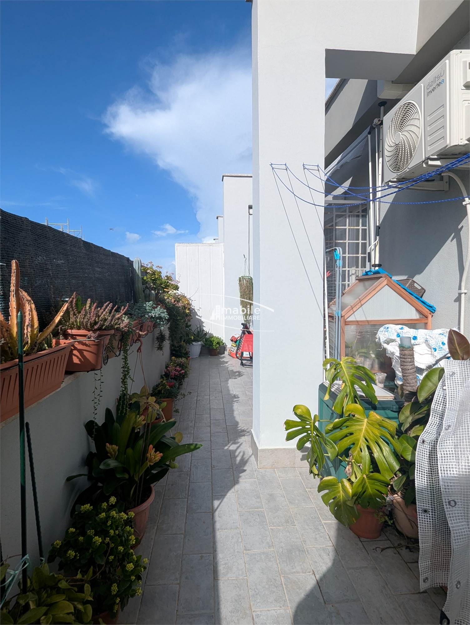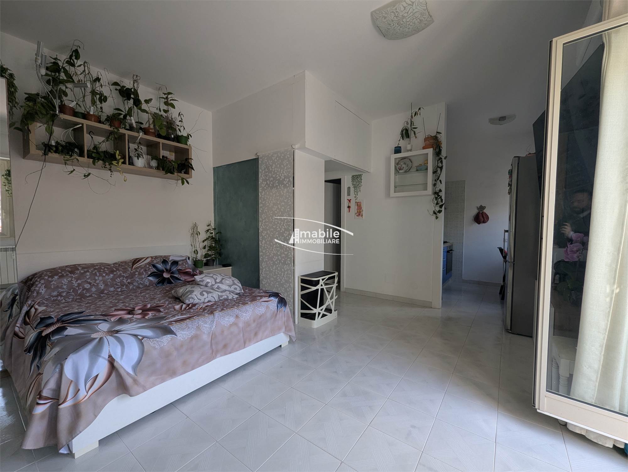 L’appartamento è così composto: un piccolo Ingresso Soppalcato con un Ripostiglio/Armadio a Muro ci porta ad una sala Open Space, un Cucinotto a vista di 5mq, un Bagno con aeratore, e un comodo Terrazzo di 20mq. La metratura calpestabile totale interna ammonta a circa 35mq.